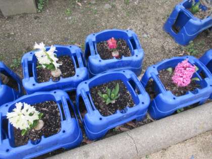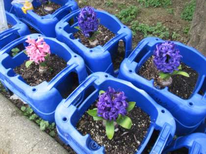 子どもたちが、植えたヒヤシンスが校庭の片隅で、きれいに咲き始めました。