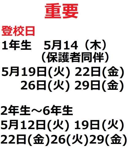 持ち物 健康観察表(当日の体温の記入を必ずお願いします。)、マスク、学習課題