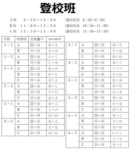 登校班の分かれ方は、本文の最後に示しております。出席番号が分からない方や、どうしても時間帯をずらして欲しい方は、学校にご連絡ください。
