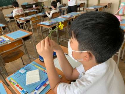5月12日(火)5年は理科の学習をしていました。「アブラナの花のつくり」の学習で子ども達はアブラナの花を真剣に観察していました。