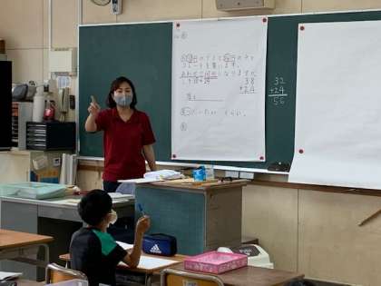 5月26日(火)2年1組では算数で「一の位の計算が10より大きくなるひっ算のしかたを考えよう」というめあてで学習していました。問題に出てきたのは38円のグミと24円のチョコレートでした。