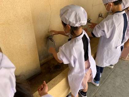 6月3日(水)A班の給食が始まりました。1階の手洗い場で、しっかりと石けんで手を洗っています。今日の給食は何かな?