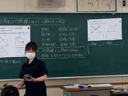 6月4日(木)A組3時間目、5年1組では、算数で「四角形を対角線で分けて三角形をつくる」という学習をしていました。「どうなるかを調べるために切り取って調べる。」という見通しが立てられていました。子どもたちは、実際に四角形を切り、調べていました。