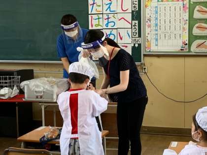 6月4日(木)1年給食の準備。担任外の先生に手伝ってもらっています。フェースシールドをしている先生もいます。フェースシールドは前がくもり、熱かこもりますので、長時間使うのはしんどいです。