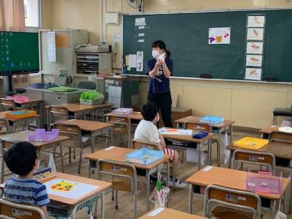 6月4日(木)B班3時間目、1年1組ではクレパスで絵を描いていました。楽しそうな絵ができていました。その後、ガーゼを出してクレパスをきれいにする方法を教えてもらっていました。