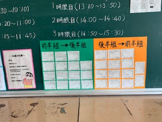 6月10日(水)5年2組の後ろの黒板に「ハッピーレーターリレー」があるのを見つけました。前半組から後半組へは、「月曜日に会えるのが楽しみです。」「朝起きるのたいへんやけど、がんばりや。」「みんなと会ってあそんだりしゃべったりしたい。」という言葉があれば、後半組から前半組には「お昼からは暑いけどがんばれ。」とお互いを励ましたり思いやる言葉がみられ、気持ちがほかほかしました。