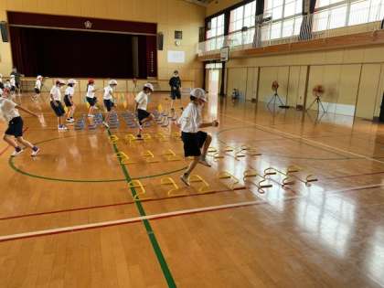 6月15日(月)3時間目、3年生は体育館で体育をしていました。低い障害物をジャンプしたり、ジグザグに細かく走ったりしながら超えていきます。今日は、大変暑かったので急遽、扇風機を出しました。