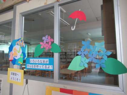 図書室の入り口のドアには、季節に合った掲示をしています。