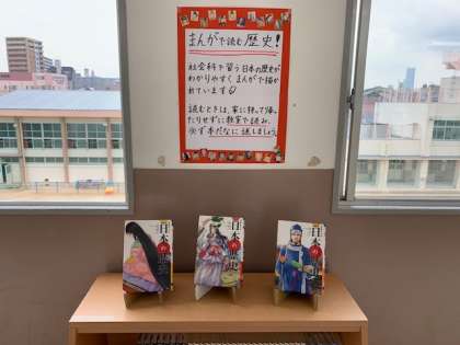 6月18日(木)6年生の廊下に「まんがで読む歴史」の本が並んでいました。6年生の社会科はそろそろ政治から歴史に単元が移っていくのかなと思いました。歴史上の人物に焦点をあてながら歴史に興味をもってくれるといいなと思いました。