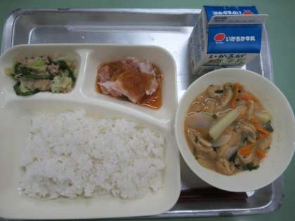 献立:鶏肉のおろし醤油かけ、みそ汁、野菜いため、ごはん、牛乳