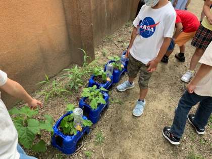6月22日(月)朝一番に1年生の何人かが体育館の方へ行っています。後をついていきますと、校舎の裏の学習園へ着きました。子どもたちがアサガオに水やりをしていました。耳を澄ましていますと「2つ咲いた。」「大きくなった。」とか聞こえてきます。まさかと思い、あとから見に行きますと咲いているアサガオはありませんでした。「2つ咲いた。」は2つ芽が伸びてきたか、2つ葉がでてきたということなのでしょう。1年生なりの表現ですが、アサガオが育ってきていることを実感しているようです。