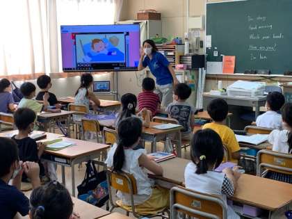 6月24日(水)朝の英語タイムで2年1組は、動画も使い、How are you?やI'm sleepy.等聞き取れたかどうか確かめながら、英語で声に出していました。