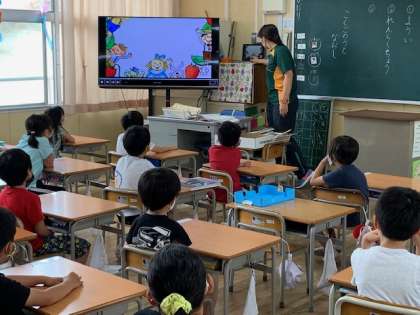 6月25日(木)朝一番の英語タイムで1年2組は「Hello,How Are You?」を学習していました。英語の歌を聞いて、どんな言葉が聞こえてきたかを先生が聞きますと、次々に子どもたちが答えていました。