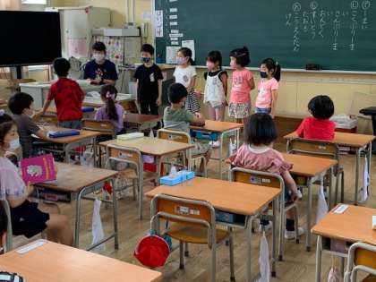 7月1日(水)1年1組は朝の会をしていました。日直や保健係が前へ出て会をすすめていました。