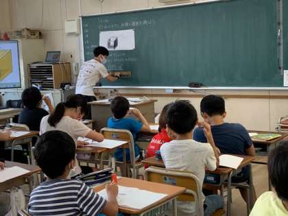 7月2日(木)4時間目、5年2組は算数で水のかさと体積の関係について学習していました。単位を換算していくのが難しい学習です。理解できたかな?