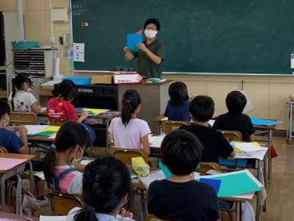 7月2日(木)5時間目、3年2組は、図工で「くるくるランド」という題材で工作を始めていました。割りピンを使ってまわるしくみを作り、立体的な作品に仕上げていくようです。先生の説明を聞く子どもたちの目が輝いていました。頭の中で作りたいものの創造がふくらんでいるようです。
