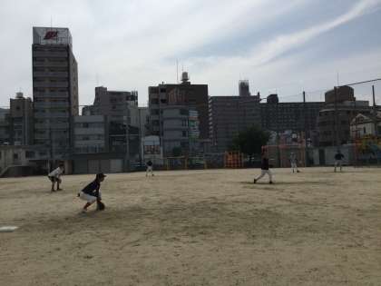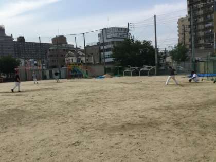 このソフトボール、粉浜小、北粉浜小、住吉第一中の男性保護者とそのOBで構成されています。概ね月に2回、日曜日の午後1時から長くて5時までの間に行われています。
