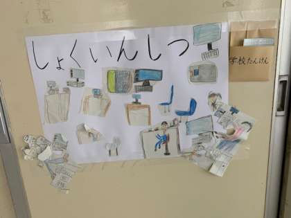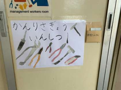 7月8日(水)校長室や職員室、管理作業員室のドアの表示が変わっていました。2年生が描いたのでしょうか?1年生を学校たんけんに案内するために作ったものだと思われます。それぞれ特徴をよくとらえています。3つの場所以外にも掲示物があるのかな?どこに掲示してあるのか、探検してみたい気分になりました。