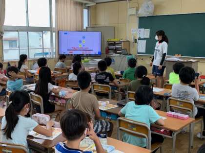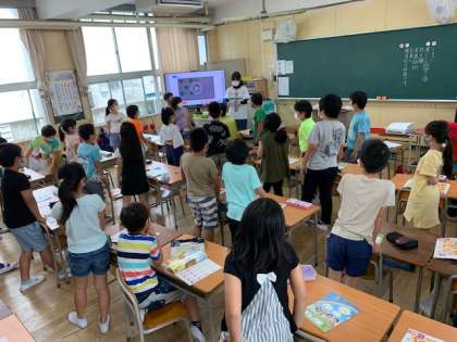 7月9日(木)1時間目、3年1組は外国語活動をしていました。20までの数を英語で言う練習をします。歌を歌いながら動画に合わせて数字を英語で言います。次に全員立って端から順に数字を英語で言っていき20の人が座ります。みんな20が自分に当たらないようにドキドキしながら英語で数字を発音していっていました。