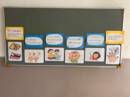 7月9日(木)保健室前の掲示板が「せいけつけんさ」バージョンになっていました。1年1組でも,ハンカチとティッシュを持っているか、名前がかいてあるかを調べていました。