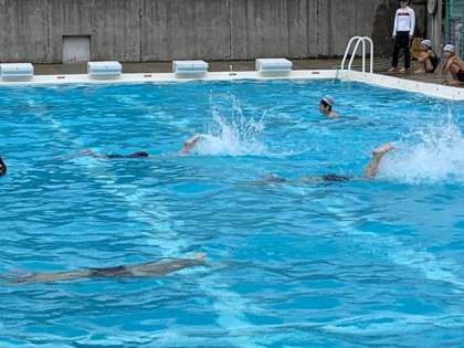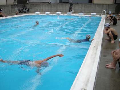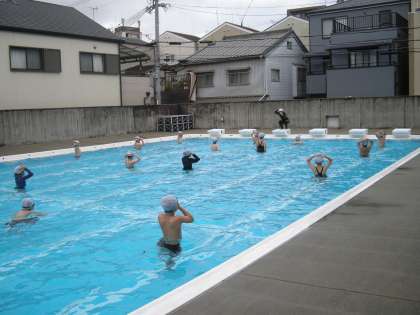 7月9日(木)3時間目に5年1組が、4時間目に5年2組が今年初めての水泳の授業を行いました。朝からの雨で時間をずらしての実施です。少し肌寒かったですが、元気に泳いでいました。