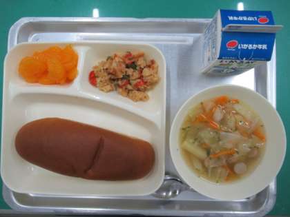 献立:パエリア、ウインナーとキャベツのスープ、みかん(缶)、黒糖パン、牛乳