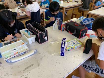 7月13日(月)1時間目、6年2組は図画工作科でテープカッターを作っていました。多くの人が色を塗っていましたが、中には釘を打って組み立てを始めている人もいました。