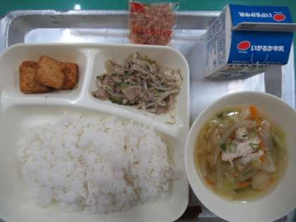 献立:ゴーヤチャンプルー、すまし汁、厚揚げのしょうが醤油かけ、かつお節、ごはん、牛乳