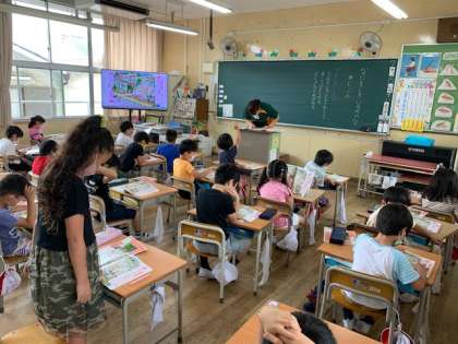 7月15日(水)4時間目、1年2組は道徳で「なにをしているのかな」の学習をしていました。教科書の学校をくわしく観察して、よくないことをしている人を見つけています。子どもたちが発表すると先生も子どもたちも必死て絵の中から探します。この後、よいことをしている人を見つけ、学校生活でのよいことと悪いことを話し合ったと思われます。
