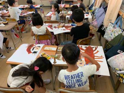 7月21日(火)2時間目、2年2組は図工でザリガニの絵を描いていました。「ザリガニとあそぶじぶんをかこう」というねらいで絵を描いていましたので。大きくザリガニを描いた後、自分を描いていました。ダイナミックな絵ができていました。