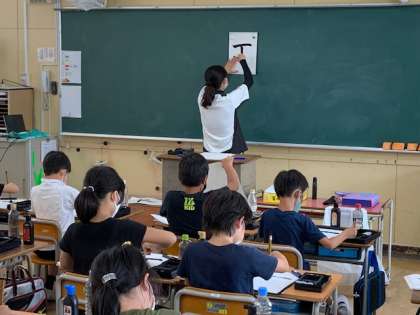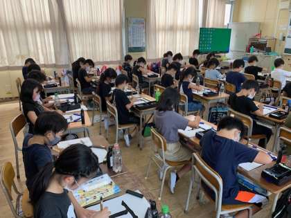 7月21日(火)5時間目、3年1組は書写の時間でした。先生の模範に続き集中して筆を動かしていました。今日の字は「下」でした。