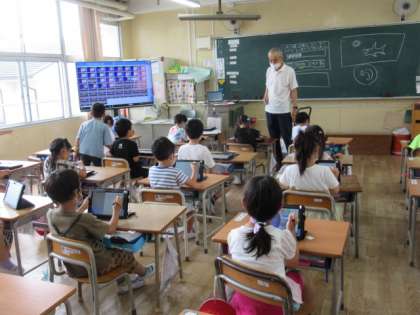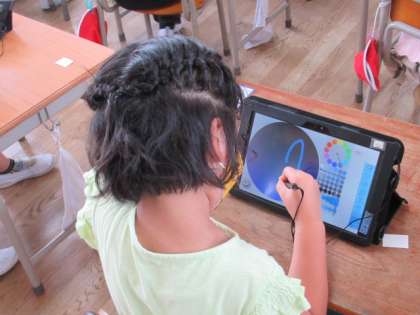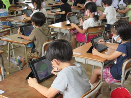 7月21日(火)5時間目、1年1組はタブレットを使ってお絵かきをしました。先生が「青色をタップしてごらん。そしたら鉛筆が出てくるから、それをタップして・・・。」と説明しながら進めていきます。子どもたちはだんだん慣れてきて絵を描いていきます。すごい!今日使ったアプリは低学年向けプログラミングソフト「ビスケット」でした。