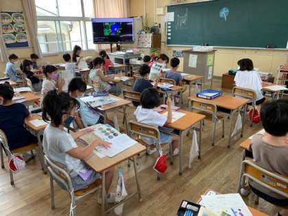 8月4日(火)1時間目、1年2組は生活科で育てているアサガオについて学習していました。一人一人がしっかりと観察し記録していました。近くの子の記録に「青のアサガオが7つありました。」と書いてあったので、声に出して読んでみると、うれしそうに「7つ咲いた。」と言っていました。それを聞いた前に座っている子が「僕は4つや。」とこれもうれしそうに話していました。