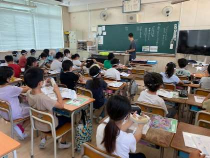 8月6日(木)1時間目、4年2組は道徳でした。「雨のバスていりゅう所で」というお話を通して学習していました。バス停にならんでいた人が雨やどりをしているすきにバスに乗り込もうとした「よし子さん」。お母さんにとめられましたが、どうすればよかったのでしょうか。子どもたちはグループでどのような話し合いをしたのでしょうか。