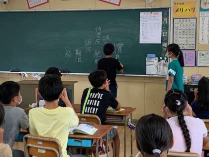 8月6日(木)1時間目、6年1組は漢字検定の練習をしていました。先生が問題集から出す問題に黒板に書いて答えていきます。半の全員が正解できたら、その班にポイントが与えられるというゲーム形式で楽しんでいました。