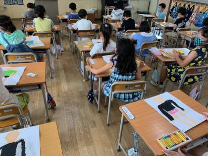 8月7日(金)2時間目、1年2組は人の絵を描いていました。先生が、顔の描き方を「目の形はどんなかな?手で形をつくってごらん。」とていねいにお話をされて進めていました。