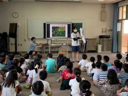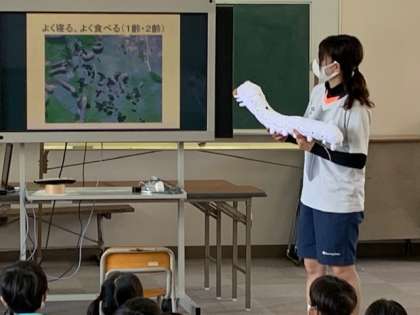 8月26日(水)1時間目、3年生は総合的な学習の時間で、これから飼育するカイコの成長について学習しました。1学期に学習したアゲハチョウのことを思い出しながら頭の中で比較しているようでした。