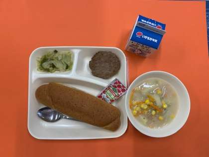 8月26日(水)焼きハンバーグ、豆乳スープ、キャベツとピーマンのソテー、ライむぎパン、牛乳