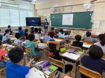 8月27日(木)1時間目、4年1組は理科で「夏の夜空」について学習していました。夏の夜空には「夏の大三角」があり、それぞれどの星座のなんという星なのかを学んだ後、NHKの番組を見て確かめていました。
