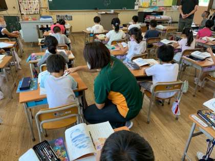 8月31日(月)1時間目、1年2組は国語で「かいがら」の読み取りの学習をしていました。うさぎのことばの続きを考えていました。