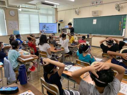 9月1日(火)1時間目、5年2組は外国語の学習をしていました。英語を使って二人一組でゲームをしていました。先生が教科名を英語で言って、当たったら消しゴムを取り合っているようでした。