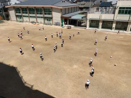 9月2日(水)4時間目、3年生は運動場で体育をしていました。ちょうどサッカーボールを使ってボールを投げる練習をしていました。