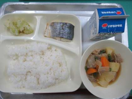 献立:さごしの塩焼き、豚肉とじゃがいもの煮物、キャベツの梅風味、ごはん、牛乳