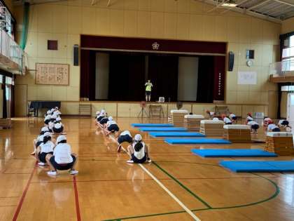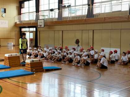 9月3日(木)2時間目、3年1組は体育館で体育をしていました。跳び箱が用意され、準備体操にかえるの足打ちなど行っていました。次に先生が跳び箱を跳ぶための手の付き方や踏み切りなどのポイントを説明していきました。説明を聞いていると簡単に跳べそうに思いました。はたして・・・。