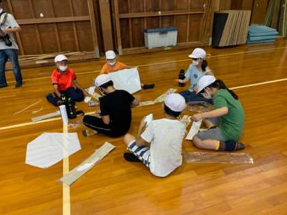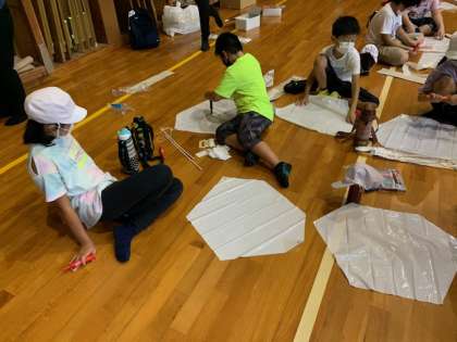 体育館で、タコ作りが始まりました。雨は小降りになり霧が出ています。