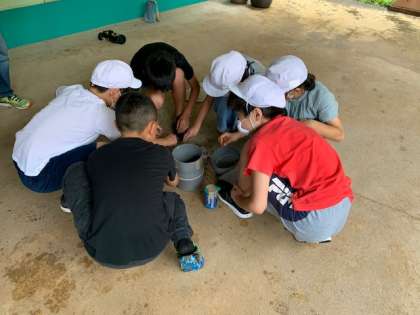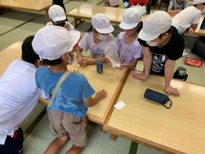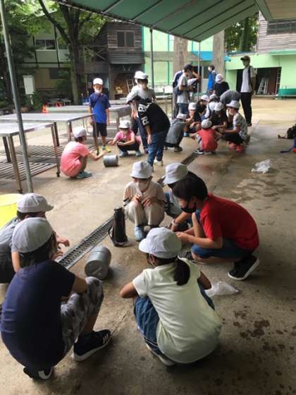 シャーベット作りを始めました。食堂でシャーベットの素を作り、雨のかからない外で容器に氷と塩を入れて、容器を協力して転がします。出来栄えやいかに・・・?