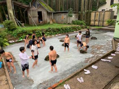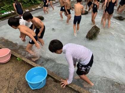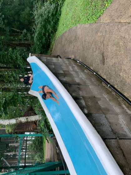 2組の魚つかみとウォータースライダー。みんな楽しんでいます。