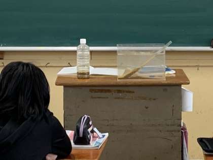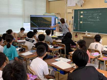 9月8日(火)1時間目、6年2組は理科で「地層はどのようにしてできるだろうか」というめあてで学習をしていました。ペットボトルや水槽を使った実験を見た後、動画で確かめていました。