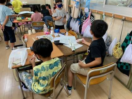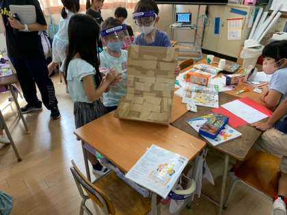 9月10日(木)2時間目、2年1組は生活科でおもちゃづくりをしていました。同じおもちゃを作った子どもが班をつくり、そのおもちゃを使って遊びを発展させているようでした。