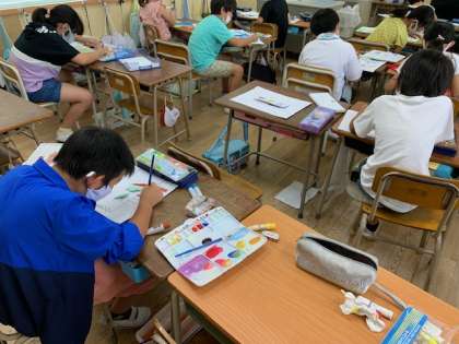 9月10日(木)6時間目、3年2組は図工で絵をかいていました。「窓をあけると」で、窓の向こうに様々な世界が現れ楽しい作品ができてきています。